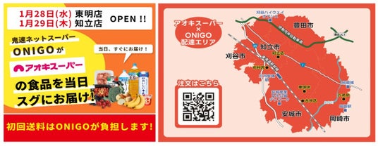 株式会社アオキスーパーは、多様化するライフスタイルに対応するため、ONIGO株式会社(以下、ONIGO)が提供する即時配達サービスを三河エリアに拡大します。三河エリアでは、東明店(安城市)・知立店(知立市)を拠点にサービスを開始し、これにより安城市、知立市、刈谷市、豊田市、岡崎市の一部が配達エリアに加わります。