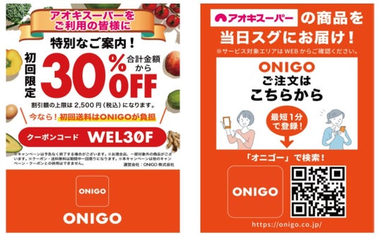 三河エリアでのサービス開始を記念し、初回のご注文に限り『ONIGOアプリ』表示価格から最大30%OFFとなる初回限定キャンペーンを全エリアで実施します。