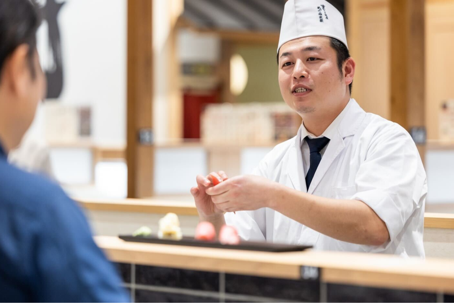 グルメ回転寿司は、職人がレーン内やカウンターで一貫ずつ寿司を握ります。三崎恵水産で目利きして仕入れた最高のまぐろを、職人の技でいちばん美味しい食べ方にして提供する。とにかく旨いまぐろを楽しんでいただく。それがネオ・エモーションです。