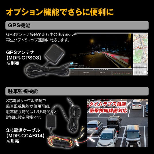 別売の3芯電源ケーブル(MDR-CCAB04)接続で駐車監視機能が使用できます。タイムラプス/衝撃検知録画に対応。
