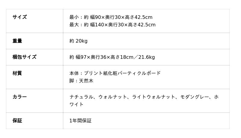 天板は約90cmから140cmの範囲で伸縮が可能です。左右にスライドするだけで、設置スペースに合わせた幅調整が行えます。