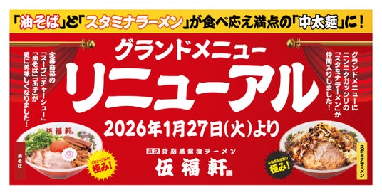 株式会社エムピーキッチンホールディングス(本社:東京都渋谷区、代表取締役CEO 鹿中 一志)が展開する「東京背脂黒醤油ラーメン伍福軒」では、2026年1月27日(火)より、グランドメニューを刷新いたします。