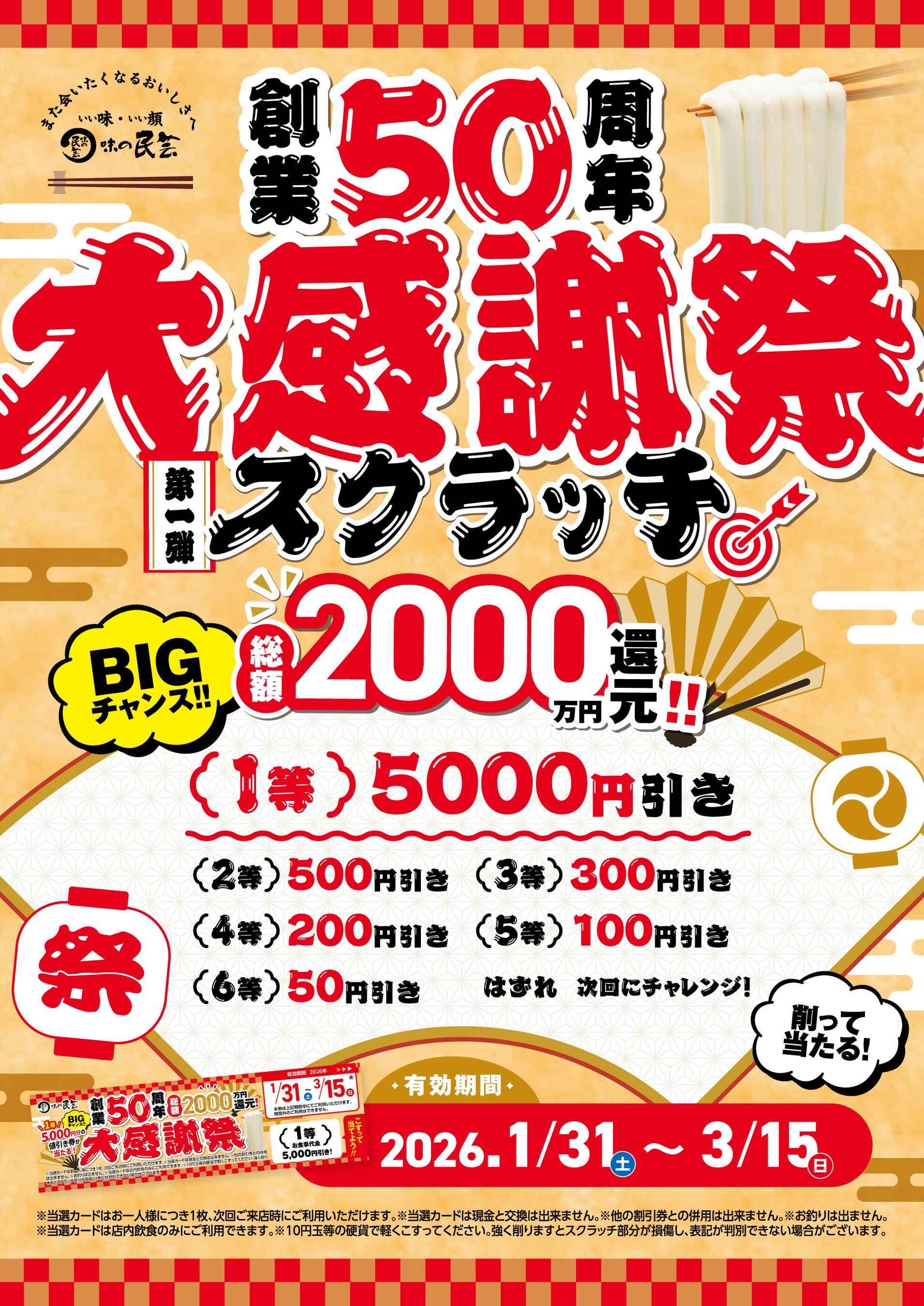 ◆実施店舗 : 全国 味の民芸51店舗◆実施期間 : その一、その二・・・2026年1月30日(金)~2月3日(火)5日間