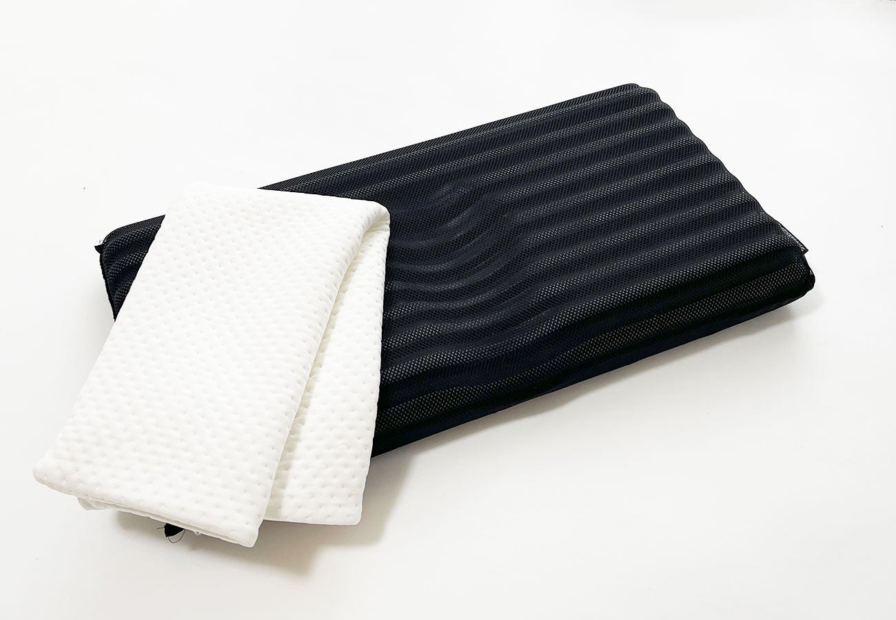 低めの枕にありがちな底付き感を解消するため、中素材に頭の形を象った独特な形状の低反発ウレタン(グミ)素材を採用。低さを保ちながらも、頭部をしっかりとした硬さで支え、平らな地面で寝ているような感覚を防ぎます。