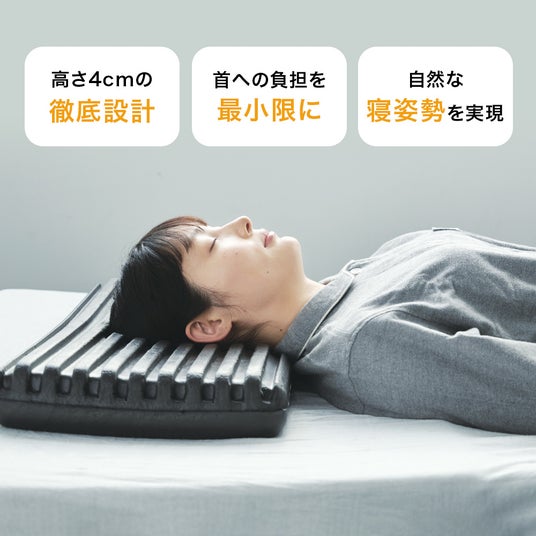 枕の高さを4cmに設定し、徹底的に低く設計しました。頭を無理に持ち上げないため、首への負担を最小限に抑えられます。ストレートネックでお悩みの方や、枕を使っていない感覚での使用を好む方にも適した設計です。