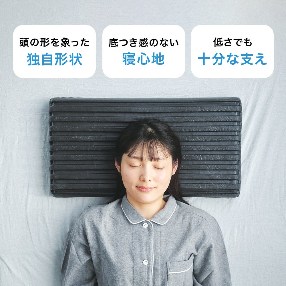 低反発ウレタン素材を採用し、高さ4cmという徹底的な低さを実現しながらも、頭部の形を象った独特な形状により、底付き感のない安定した寝心地を提供します。