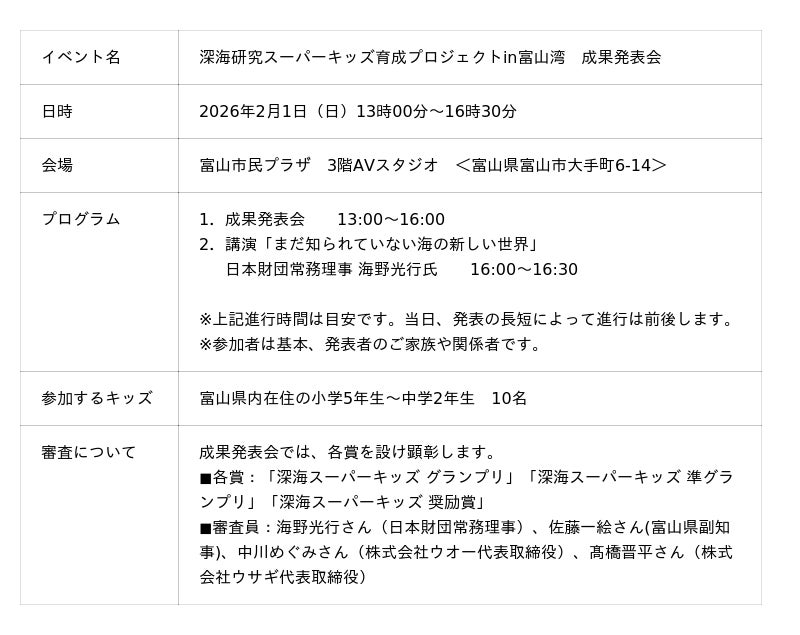 一般社団法人とやまミライラボでは、日本財団が推進する「海と日本プロジェクト」の一環として、県内の小中学生を対象とした「深海研究スーパーキッズ育成プロジェクトin富山湾」を実施してまいりました。