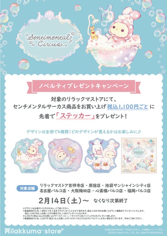 サンエックス株式会社(本社:東京都千代田区)は、センチメンタルサーカスの新テーマ『ぬくもり泡沫シャボンの夜に』の商品が2月より発売されることに際し、一部店舗(※)でキャンペーンが実施されることをお知らせします。