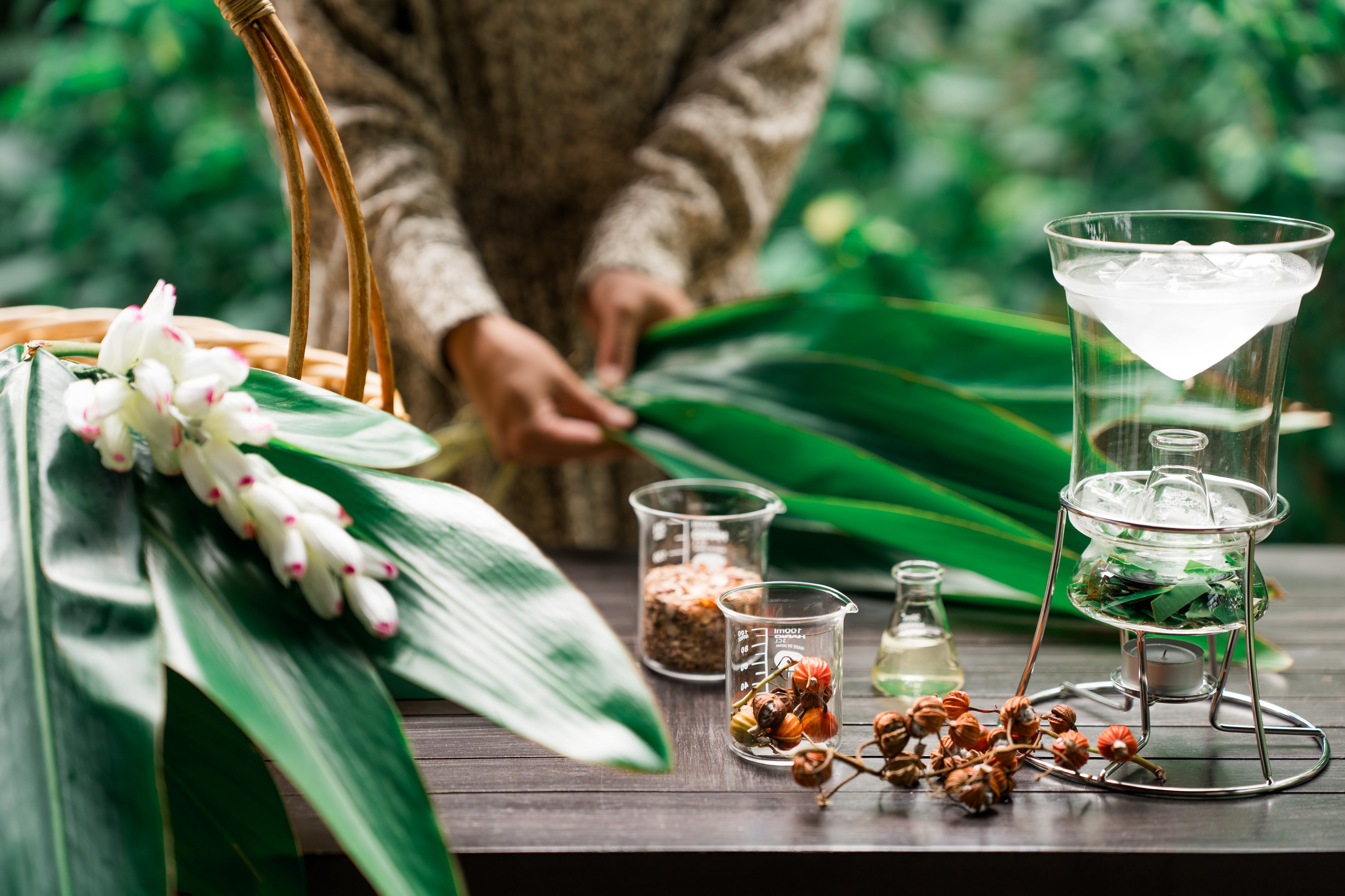 月桃は、虫よけとして家に植えられたり、防虫剤代わりにタンスに入れたりと、昔から西表島の暮らしの中で活用されてきました。本プランでは月桃農園へ訪れ、葉や花の収穫を行い、摘みたての月桃を使ってボタニカルウォーターを作ります。完成したボタニカルウォーターは、虫よけやお部屋のアロマミストとして滞在中に使用でき、いつでも月桃の香りを楽しめます。