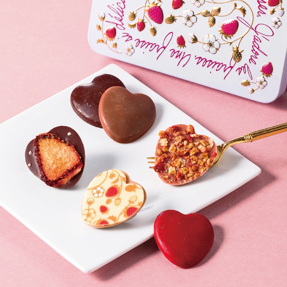“日本に合うショコラ”を目指し、ショコラの可能性を追求するショコラトリー。苺をかたどったミニサイズの板チョコレート6種類をかわいい缶に詰め合わせました。