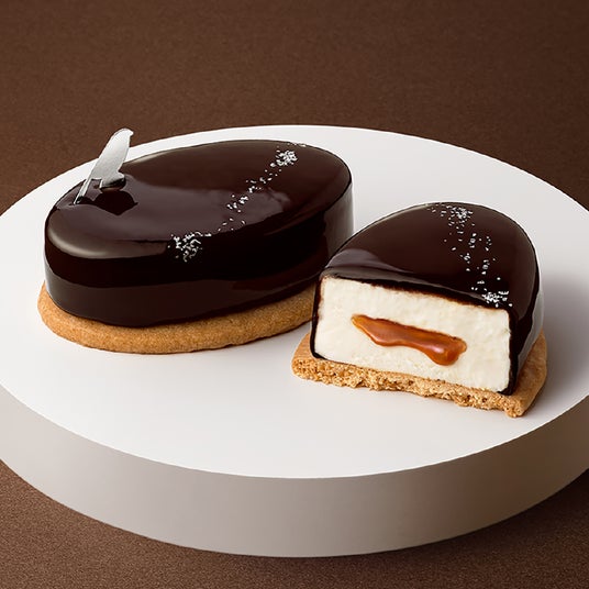 北海道バター使用のキャラメルソースが入った口どけなめらかな北海道生乳のチーズムースを、ショコラの味わいで包み込みました。それは、まるで真冬の星空を深々と静まる水面が映しているかのよう。ショコラシーズンだけに出会える、特別なフロマージュケーキです。