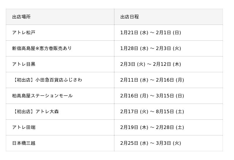 ※出店日程は予告なく変更になる場合がございます。予めご了承ください。