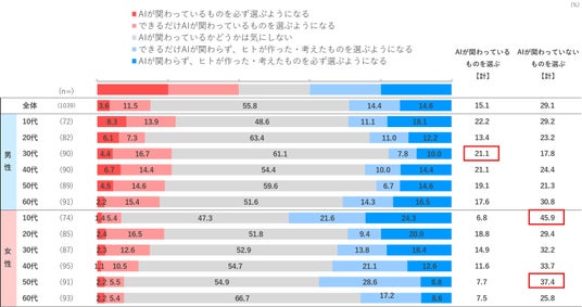 2026年の商品やサービス、コンテンツの選び方は、「AIが関わっているものを選ぶ【計】」15.1%を、「AIが関わっていないものを選ぶ【計】」29.1%が上回っています。「AIが関わっているものを選ぶ【計】」が上回るのは男性30代のみで、他は「AIが関わっていないものを選ぶ【計】」が上回り、中でも女性10代と50代が高めです。但し、現状では全体の半数以上は「AIが関わっているかどうかは気にしない」と考えています。