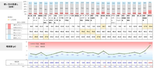 お金の使い方を“減らしたい・節約したい”よりも“増やしたい・充実させたい”が上回ったのは「預貯金」のみ。前回2025年時に引き続き、幅広い商品カテゴリーで消費を増やしたい意向よりも、節約意向が上回る。
