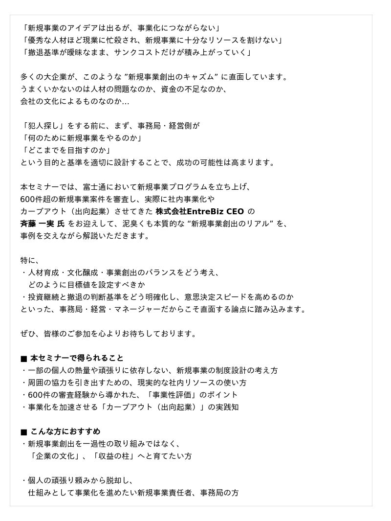本セミナーでは、株式会社EntreBiz CEO 斉藤 一実 氏 をお招きいたします。