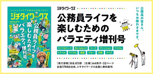 創刊より全国の自治体の様々な取り組み事例を届けている『ジチタイワークス』ですが、取材で知る公務員の皆様の仕事ぶりや熱量に感動を覚えることも少なくありません。そのような公務員の皆様に少しの安らぎの時間を提供したいという思いから、ジチタイワークス編集室では「公務員のためのバラエティ班」を立ち上げました。「公務員ライフを楽しむためのバラエティ増刊号」には、自治体・公務員にまつわる多彩なコンテンツをぎゅっと詰め込んでいます。前回2025年1月に発行したところご好評をいただき、2回目の発行となりました。心と頭を休めながらも、公務員ライフを楽しく、豊かに感じていただけることを願い、お届けします。なお、今回の増刊号は、全国1,788の自治体で働く職員の皆様、ジチタイワークス会員がご提供対象になります。