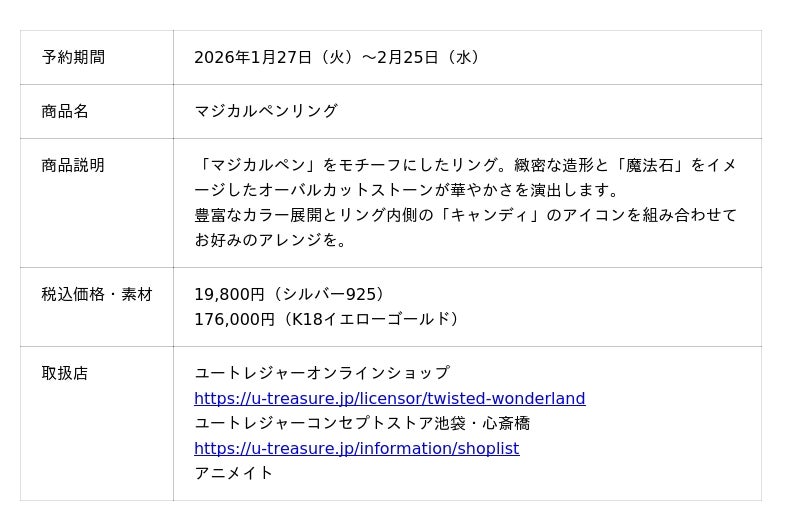 株式会社ユートレジャー(本社:東京都新宿区、代表取締役社長:青木 興一、株式会社ケイ・ウノの連結子会社)は、『ディズニー ツイステッドワンダーランド』に登場する「マジカルペン」をモチーフにしたリング(指輪)を再販売いたします。2026年1月27日(火)~2月25日(水)の期間、ユートレジャーオンラインショップ、ユートレジャーコンセプトストア池袋・心斎橋にて予約受け付けを行います。