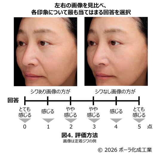 Web アンケートにて、パソコン画面上に“散在シワあり”と“シワなし”、または”定着ジワあり“と“シワなし”の画像をそれぞれ提示し、評価項目について、「左の画像の方がとても感じる」~「右の画像の方がとても感じる」の中から最も当てはまるものを1つ選んでいただきました。各評価者の回答結果を、「シワあり画像の方がとても感じる(0 点)」から「シワなし画像の方がとても感じる(5 点)」までの6段階の点数にしました(図 4)。