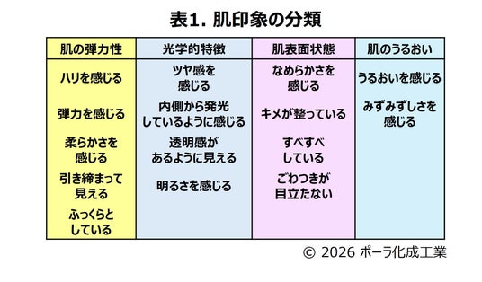 徴」に関する 4 印象、「肌表面状態」に関する 4 印象、「肌のうるおい」に関する 2 印象に分類し、それぞれの分類での平均点を求めました(表 1)。