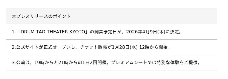 NRE&TAOエンターテイメントパートナーズ合同会社(野村不動産株式会社〔本社:東京都港区/代表取締役社長:松尾大作、以下「野村不動産」〕と株式会社タオ・エンターテイメント〔本社:福岡県福岡市/代表取締役社長:藤高郁夫、以下「タオ・エンターテイメント」〕がエンターテインメント事業に取り組むために設立)は、和太鼓パフォーマンス集団DRUM TAO(以下「DRUM TAO」)の専用劇場『DRUM TAO THEATER KYOTO』(以下「本劇場」)を、2026年4月9日(木)に開業することを決定し、チケットの販売を2026年1月28日(水)12時より開始いたします。