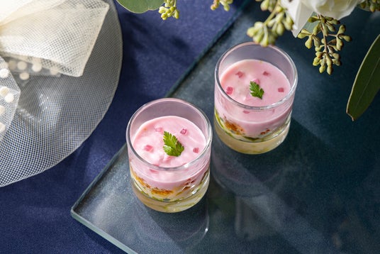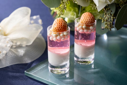 ココナッツゼリーの上に桜ゼリーを重ね、パールと白いちごで彩った、見た目も味わいも春色満載のグラススイーツ。いちごの甘酸っぱさ、桜の香り、ココナッツの優しい甘味が三重奏を奏でます。