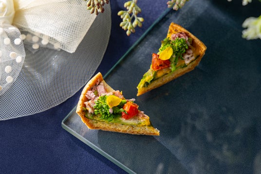 桜の葉で香りづけをした自家製ベーコンがアクセントになった具だくさんのキッシュ。たけのこや菜の花といった春野菜を合わせ、心地良い苦味が風味に奥行きを与えます。