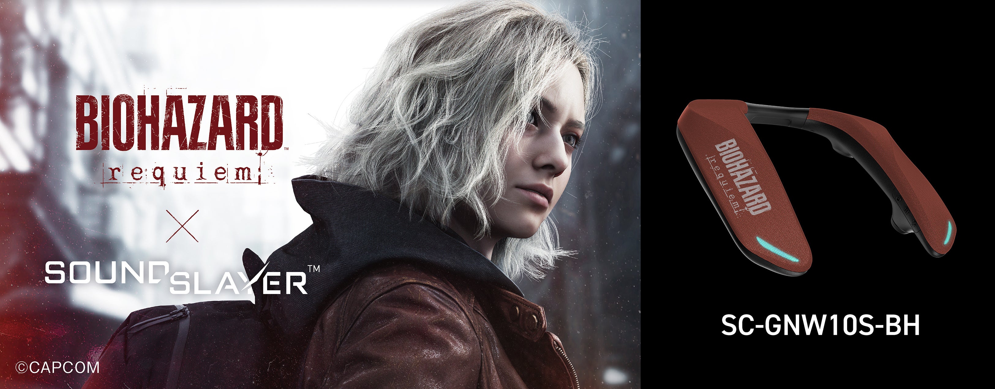 ゲーミングネックスピーカー「SC-GNW10S」は、4つのスピーカーによる迫力のサラウンド、人間工学に基づいた快適な装着感、直感的な操作性で、圧倒的な没入感(※2)と低遅延ワイヤレス接続を両立し、多くのゲーマーから高い評価を得ています。今回発売するコラボモデルは、その高い基本性能を継承しつつ、『バイオハザード レクイエム』の世界観を取り入れ、さらに特別な体験を提供します。