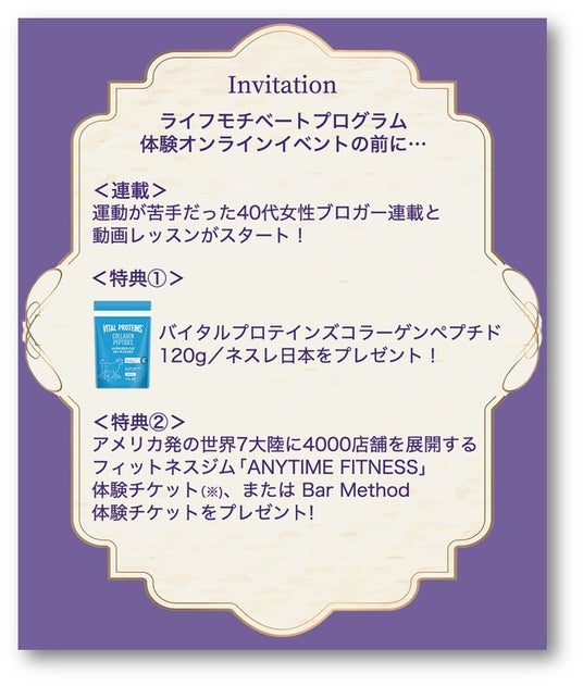 ネスレ日本株式会社 ネスレ ヘルスサイエンス カンパニー(本社:兵庫県神戸市、カンパニープレジデント:中島 昭広)は、24時間年中無休のフィットネスジム「ANYTIME FITNESS(エニタイムフィットネス)」の国内マスターフランチャイジーである株式会社Fast Fitness Japan(本社:東京都新宿区、代表取締役社長:山部 清明)、株式会社講談社(本社:東京都文京区、代表取締役社長:野間 省伸)の「mi-mollet(ミモレ)」と連携し、ミドルエイジ女性の健康習慣づくりをサポートする新プロジェクト『ライフモチベートプログラム』を2026年1月より本格始動しました。