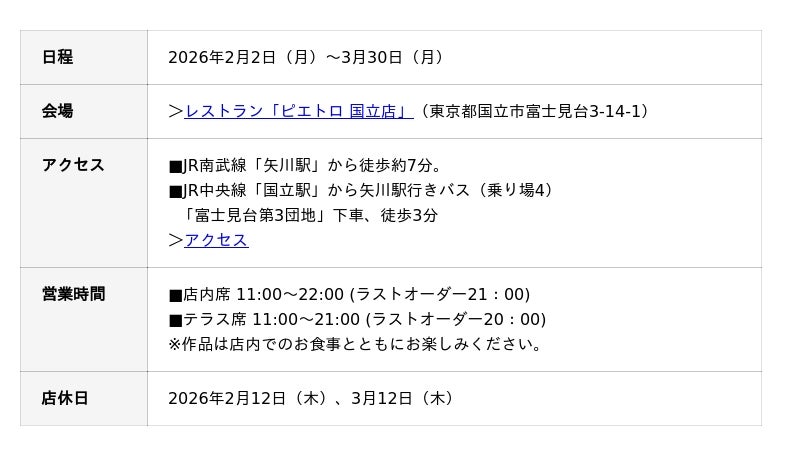 今回、第25回コンテストの優秀作品26点を、2026年2月2日(月)~3月30日(月)まで、レストラン「ピエトロ 国立店」にて展示します。