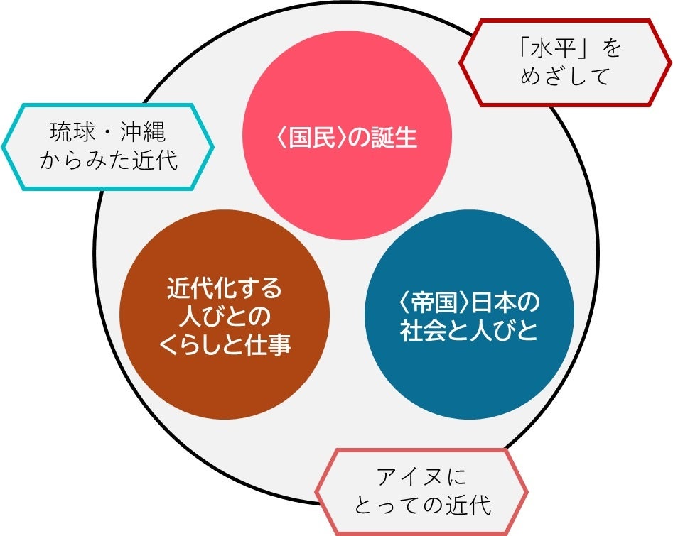 19世紀なかば過ぎ、日本は世界的な通商条約網に組み込まれました。明治維新はこうしたなかで行われ、新政府は近代国家をつくりはじめます。資本主義のしくみを整え、学校や軍隊を軸にして人びとを〈国民〉とする政策が行われました。「文明開化」は人びとの意識や生活様式を変えていきます。やがて日本は対外戦争を経て植民地を持つ国になります。こうした経験のなかで人びとは自らを〈国民〉と意識するようになっていきました。近代化する人びとのくらしと仕事