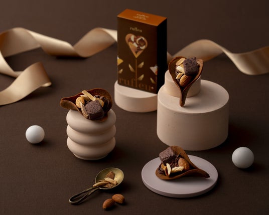 「ルフル アーモンドチョコレート」は、ココア生地のラングドシャにチョコレートクリームをたっぷりと絞り、生チョコを贅沢にひと粒トッピングしました。さらに、形の異なる3種のアーモンドをあしらい、食感にアクセントを加えた満足感のある一品です。プチギフトにも最適な、可愛らしい1個入ボックスでの販売です。