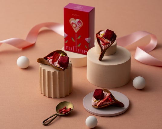 「ルフル ベリーチョコレート」は、ほろ苦いココア生地で焼き上げた花びら型ラングドシャに甘酸っぱいベリーチョコレートクリームをたっぷりと絞り、フランボワーズの生チョコレートを贅沢にひと粒トッピングしました。さらに、フリーズドライ苺とピスタチオを散りばめ、華やかで満足感のある一品です。