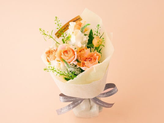 バラやスイートピーを束ねたやさしい色合いのブーケ。 花の間からちらりと顔を出す小花は、まるで猫が楽しそうに遊んでいるかのようです。 大切な方へのギフトには、プラス110円でリボンと袋をお付けします。