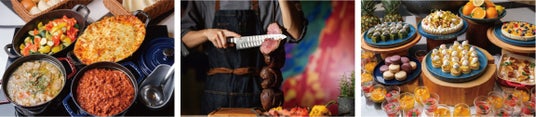 上質な肉塊をダイナミックに串刺しにしてショーキッチンでグリルし、焼き立てをゲストの目の前でカットするシュラスコスタイルのメインディッシュは、牛肉の希少部位イチボやカイノミ、ラム肉、豚肉、鶏モモ肉などが揃います。シンプルな味つけでジューシーに仕上げ、肉本来の旨みを引き出しつつ、能登塩や金沢柚子胡椒味噌、万能ソース“ビナグレッチモーリョ”、“サルサ”をはじめ全11種のバラエティ豊かなソースとともに、様々なテイストで堪能できるのも魅力です。また、ペルーを代表する魚介のマリネ“セビーチェ”、地中海沿岸発祥の“エスカベッシュ”など、多国籍なメニューも多彩に並びます。ひよこ豆をペースト状にした中東料理のひとつ“フムス”はクリーミーな食感とコクが特長で、野菜にディップしても美味しい“ワカモレ”といったヘルシーなアイテム、シーザーサラダを自分好みでカスタマイズできるセクションにもご注目を。さらに、牛すじを煮込んだブラジルスタイルのスープ、アメリカ・テキサス州の郷土料理“チリコンカン”など食欲をそそる温かい料理もラインアップするほか、“マンゴーのムース”や“グリルパインタルト”等7種のデザートもお見逃しなく。
