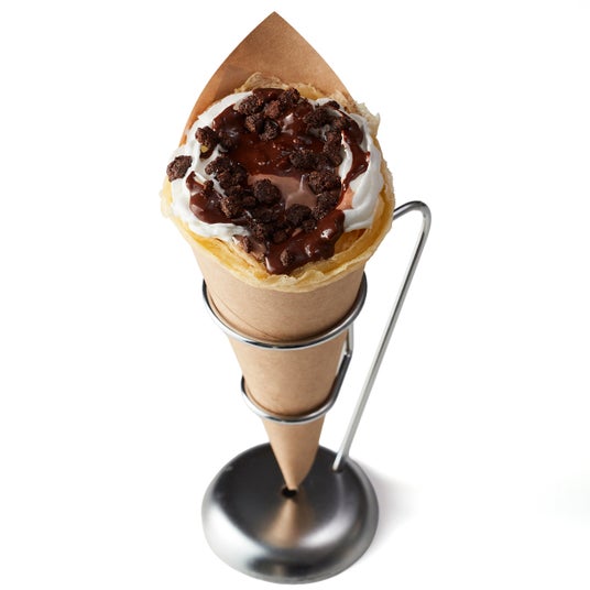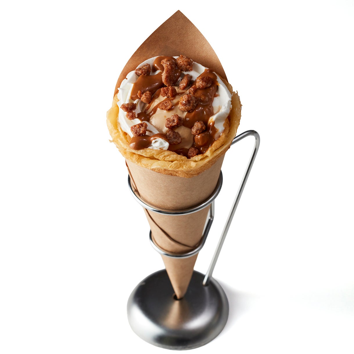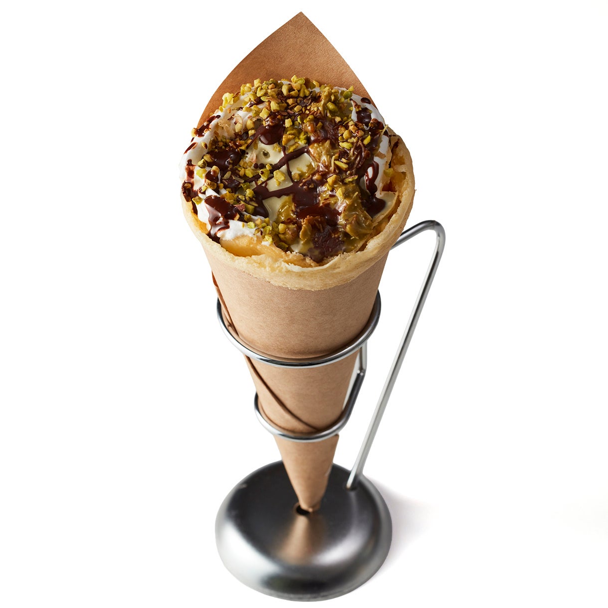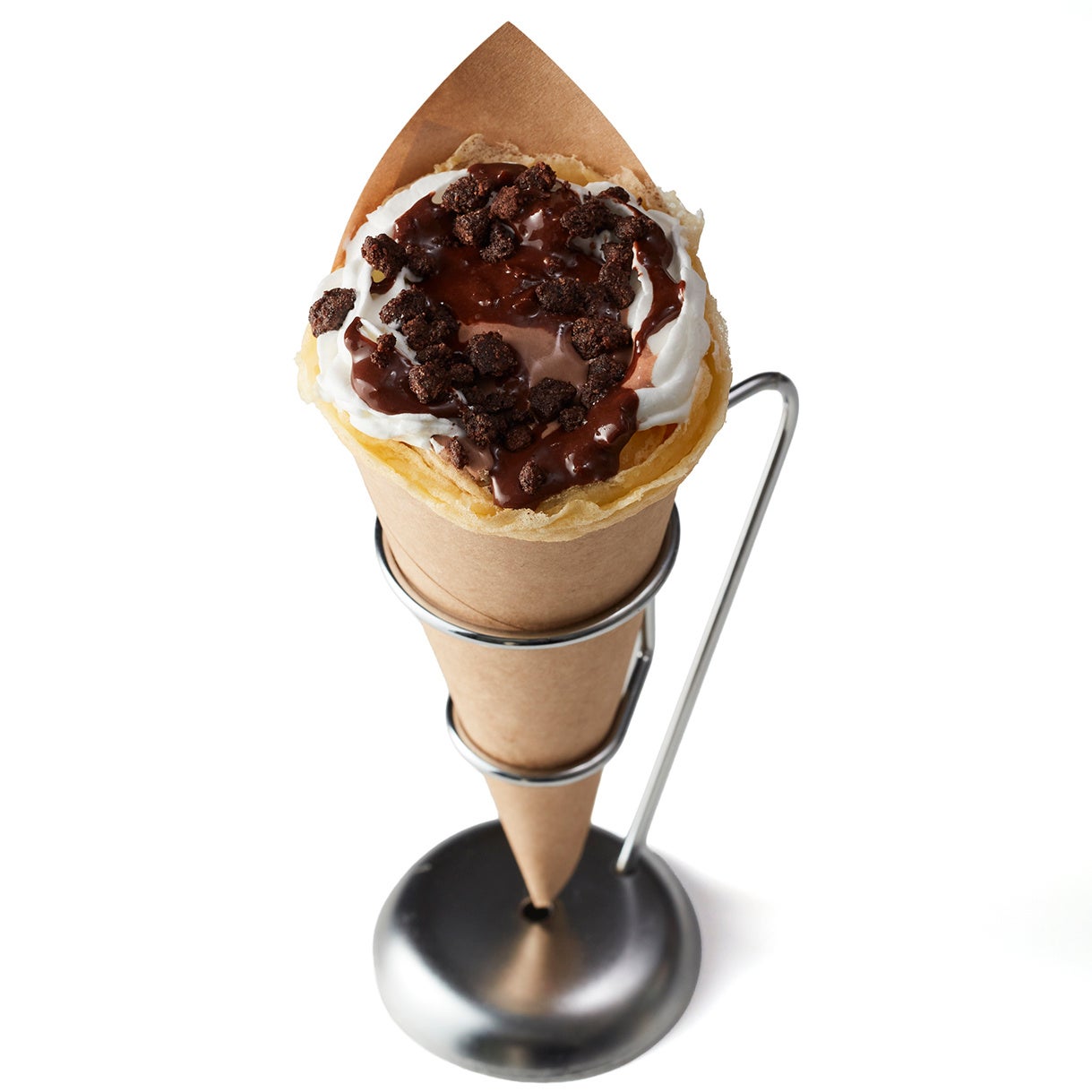 会場内で一枚一枚焼き上げたクレープに、ジェラートや多彩な素材を包み、できたての味わいをご提供します。イタリアから届くミックス粉で作る、もっちり香ばしいクレープに、生クリームとうまみたっぷりのオリジナルソース、香ばしいローストピスタチオ、食感が楽しいチョコレートやカダイフ、クランブルクッキーを重ね、濃厚なジェラートとともに贅沢に包み込みました。