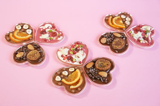 ハート型のチョコレートに、ナッツやドライフルーツを彩り豊かにトッピング。見た目も可愛くプレゼントに最適。