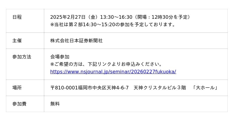 福岡での開催は初めての参加となり、多くの投資家の皆様に当社へのご理解を深めていただける貴重な機会と考えております。