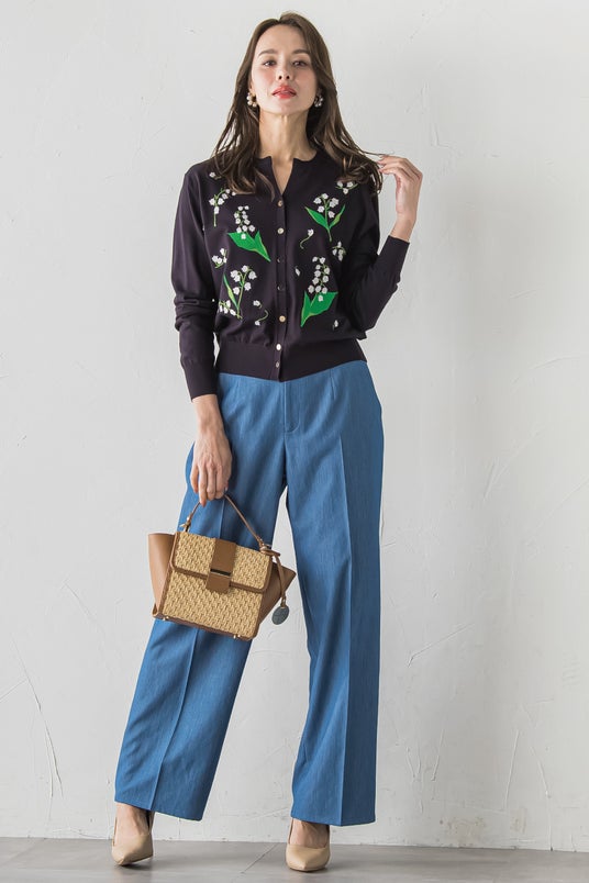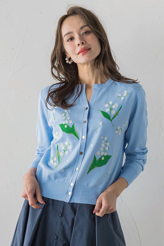 繊細で華やかなスズランのオリジナル刺繍をあしらったカーディガン。刺繍には立体感を演出するためにポイントでパールを手付けし、可愛らしさと上品さを両立させています。女性らしいキーネックデザインに、洗練されたメタルボタンがアクセント。素材には滑らかでシーズンレスに着用できるレーヨンポリエステル混紡糸を使用し、快適な着心地を実現しました。特別な日にもデイリーにも映える華やかさを持つ一枚でありながら、上品でさりげない存在感があります。