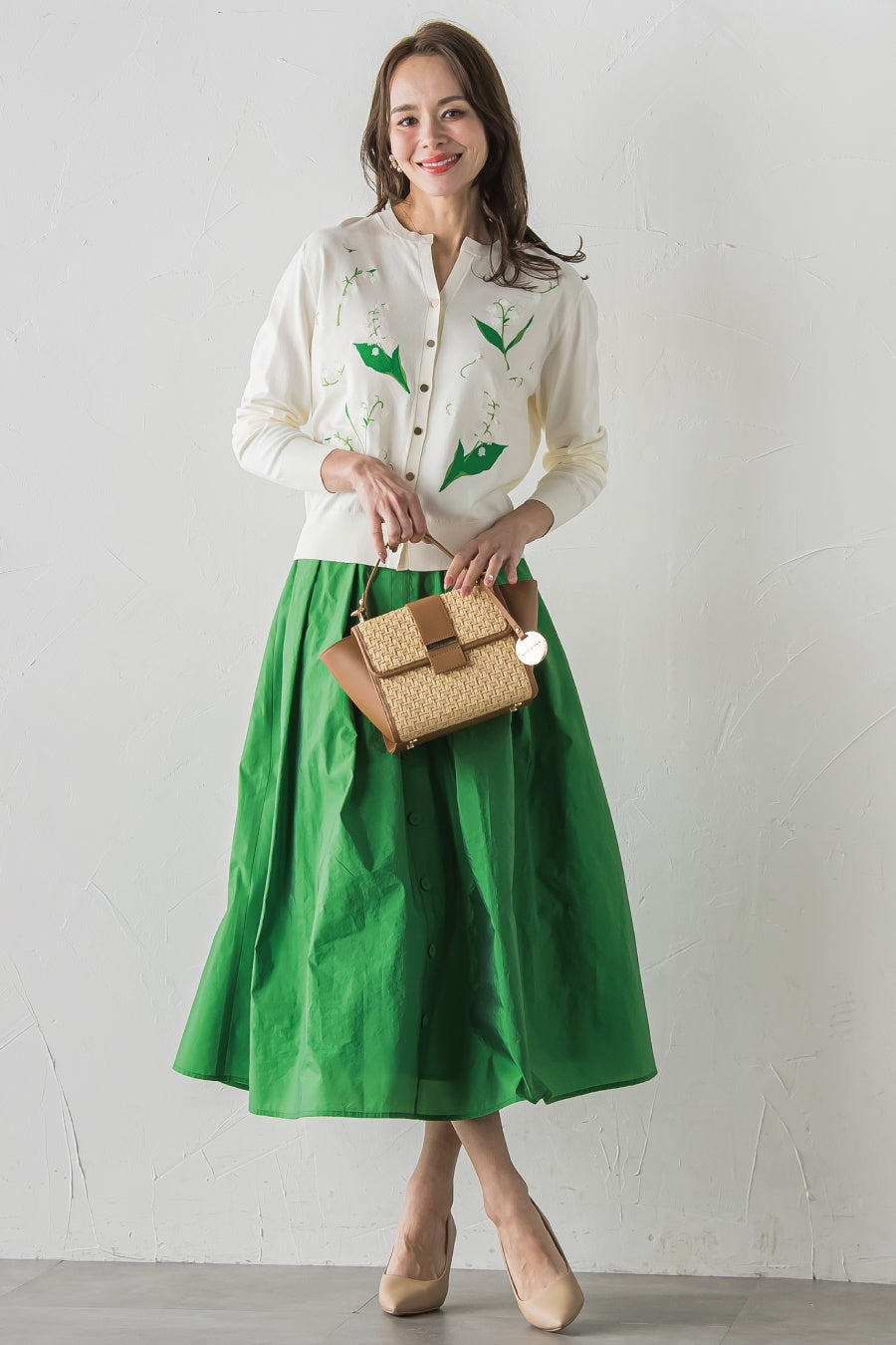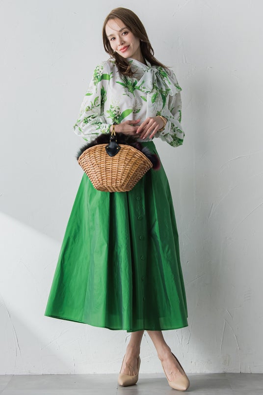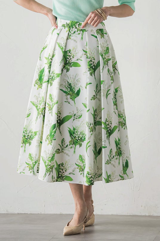 繊細に描かれたスズランが静かに華やぐ、春の気配を纏うフレアスカート。程よいハリ感を持つ上質なタフタ素材が、立体的なタックと相まって、動くたびに美しく広がる、ドラマティックなシルエットを生み出します。甘すぎず、でも女性らしいーー絶妙なバランスで、大人のフェミニンを引き立てる一着です。シンプルなトップスと合わせるだけで、装いに春らしいやさしさと存在感を添えてくれます。