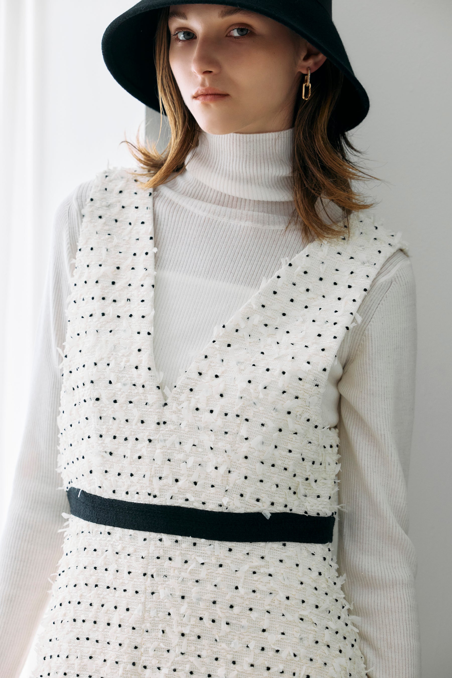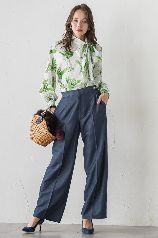 華やかさのポイントは、サイドにあしらわれた存在感のあるビッグボウタイ。上品に仕立てたセットインスリーブと、袖口のふんわりパフデザインがフェミニンなアクセントを添えます。素材には程よい落ち感のある大人タフタを使用し、動くたびにしなやかな表情を見せる一枚。繊細に描かれたスズランプリントが静かに華やぎを運び、春の訪れを感じさせます。一枚で絵になる、フェミニンで上品なスタイルを叶える主役アイテムです。
