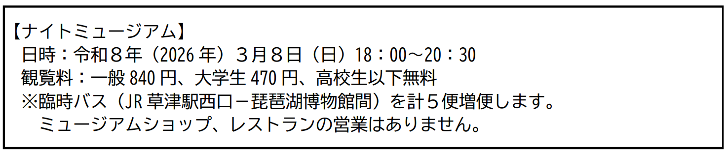 琵琶湖博物館では、令和8年(2026年)3月8日(日)にナイトミュージアム、20日(金・祝)に宿泊付きのプレミアムナイトツアーを実施します。展示室の特別照明やクラシックコンサート、近江の地酒の試飲、学芸員による展示解説など通常の開館時間では体感・体験できないコンテンツで夜ならではの博物館をお楽しみいただきます。