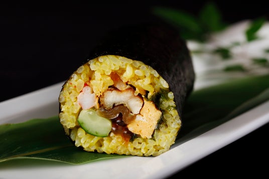 伝助穴子、筋子醤油漬け、玉子焼き、胡瓜、干瓢、蟹棒、海老おぼろ、香味海苔、煎り胡麻、サフラン酢飯