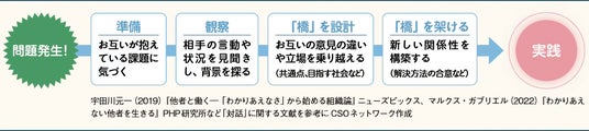 両者の間に存在するギャップを埋めるための「創造的対話」によって問題の解決をしていくことが求められます。たとえば、一人ひとりの尊厳が保障される公正で持続可能な社会をミッションとして活動する一般財団法人CSO ネットワークでは、図のようなプロセスで対話を進めています。