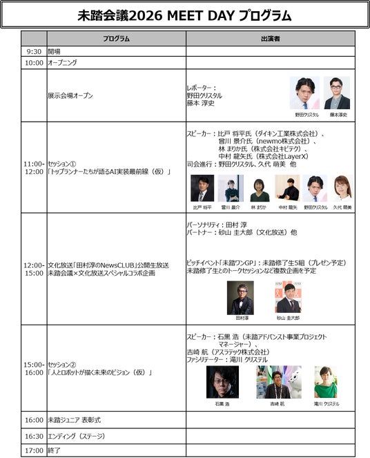 イベント名:未踏会議2026 MEET DAY日時:2026年3月7日(土)10:00~17:00(予定)受付開始 9:30