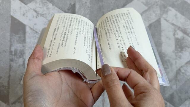 また、本の帯をつけたままでも着脱はちゃんとスムーズに行えました。本の帯をつけたまま読むと、読んでいる途中で帯だけ外れて読みにくかったりしますが、これならそんな心配とも無縁です。