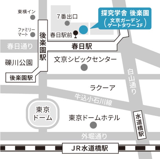 「探究学舎 後楽園」は、東京・後楽園駅および春日駅に直結した、便利でアクセスの良い立地に新しく開校します。この新しい校舎では、地域の教育環境に新たな風を吹き込み、親子が一緒に学び、共に成長できる場所を提供します。