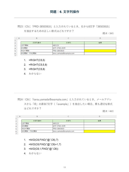 実務で頻出する、1.四則演算2.表示形式3.基本関数4.データ集計・分析5.データ検索・参照6.文字列操作7.エラー処理8.データ整形の8領域を網羅。現場のボトルネックとなりやすいポイントを重点的にチェックできる問題設計となっています。