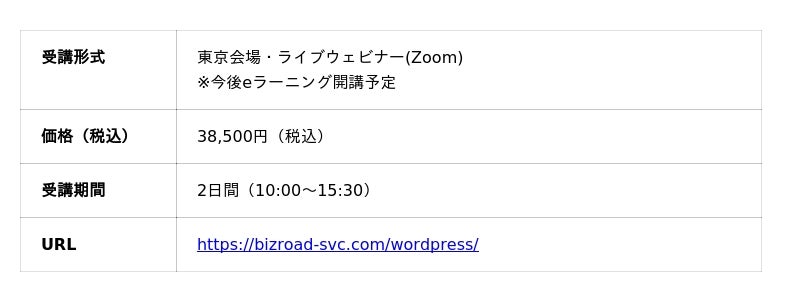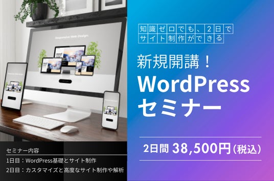 このような背景から、WordPress未経験者でも2日間でサイト構築の全工程を習得できるカリキュラム「WordPressセミナー」を開講いたします。