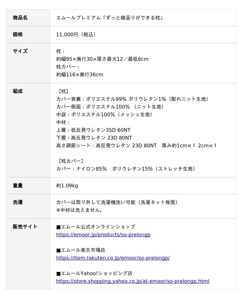 「身体に合った寝る・座る・たたむ」を提供する健康家具ブランドEMOORを展開する株式会社エムール(東京都立川市:代表取締役 高橋 幸司/以下、エムール)は、2026年1月27日より「エムールプレミアム ずっと寝返りができる枕」の販売を開始しました。