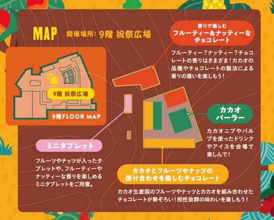 阪急うめだ本店「バレンタインチョコレート博覧会」の代名詞ともいえる人気企画カカオワールド。今回は、カカオワールド果樹園と題し、フルーツであるカカオを使用したドリンクやディッシャーアイスのイートインが充実。さらに、カカオ生産国で採れるフルーツやナッツを使用したチョコレートや、約80種類が集積されたミニタブレットコーナーなど、チョコレートの原料であるカカオの全てが凝縮した注目の売場です。